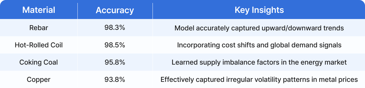 For rebar, scrap metal prices were the most influential variable, while for copper, global economic indicators had a significantly greater impact. Since the key variables differ by raw material, Deepflow enhances accuracy by analyzing correlations across datasets and incorporating the most impactful variables into the model.