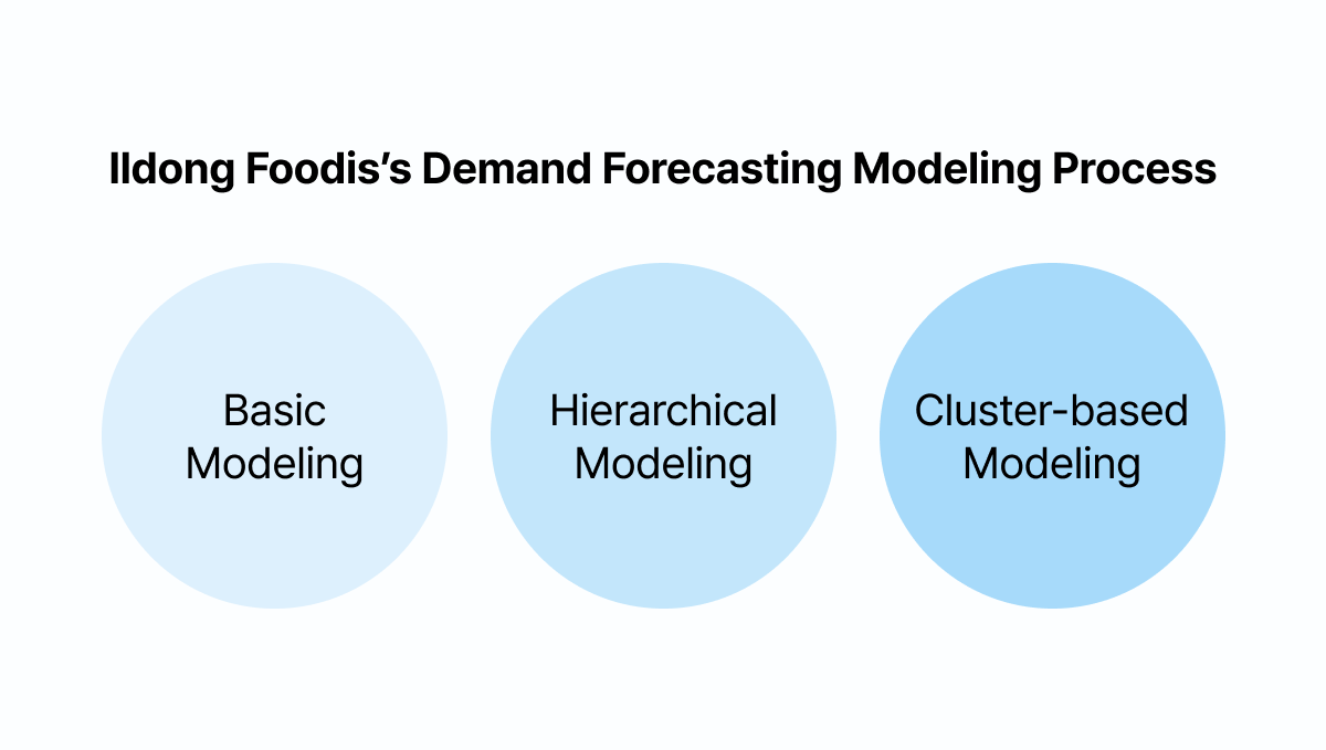 The modeling process began with baseline modeling, followed by Hierarchical Modeling that reflected product group and channel structures, and then Cluster-based Modeling, which grouped products with similar demand patterns to improve learning efficiency.