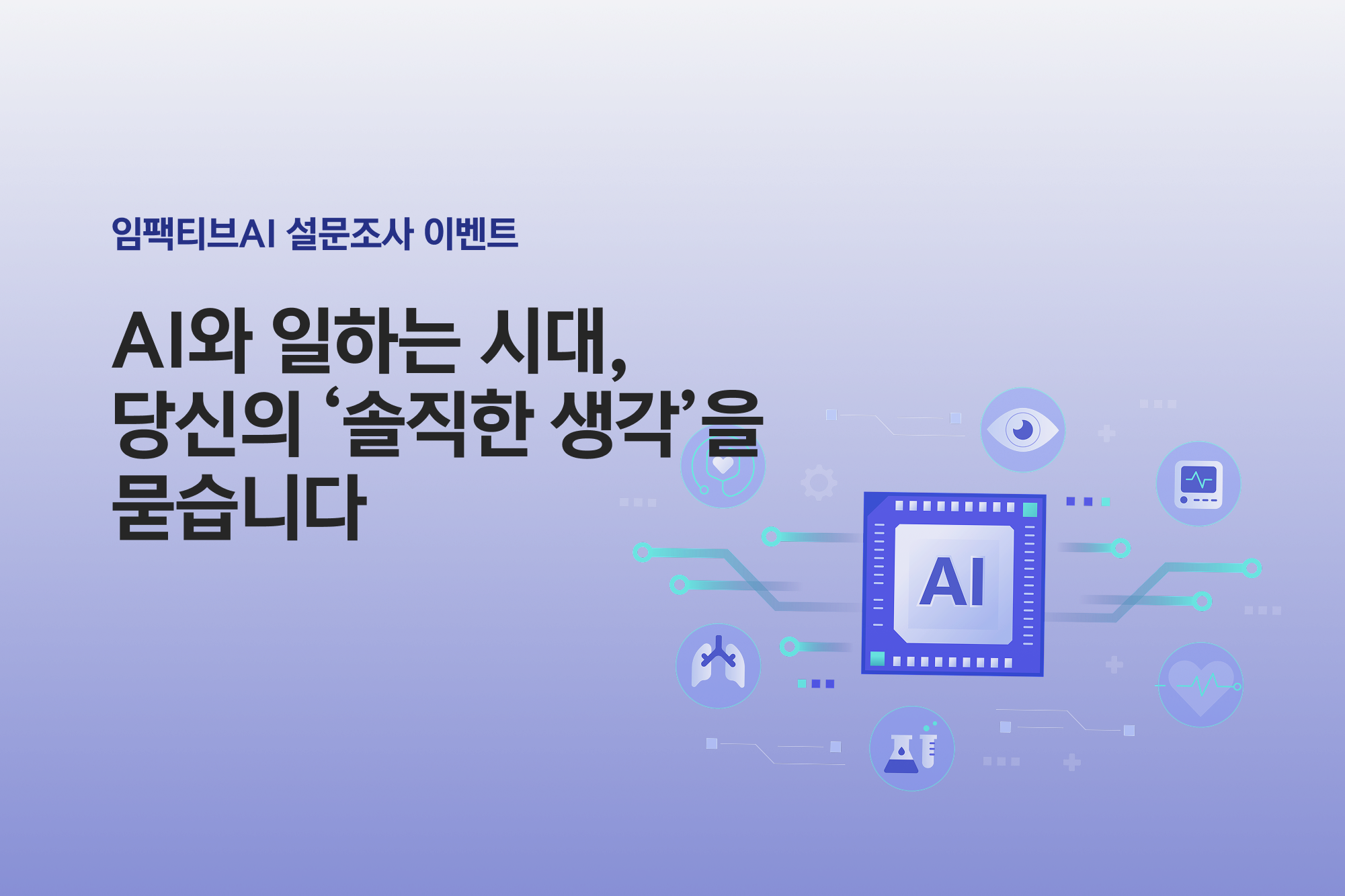 업무 현장에서 AI 활용이 어떻게 이뤄지고 있는지, 그리고 AI 도입에 대한 인식을 확인하기 위해 임팩티브AI가 간단한 설문조사를 진행합니다. AI를 자주 쓰지 않거나 아직 익숙하지 않으셔도 참여하실 수 있습니다.