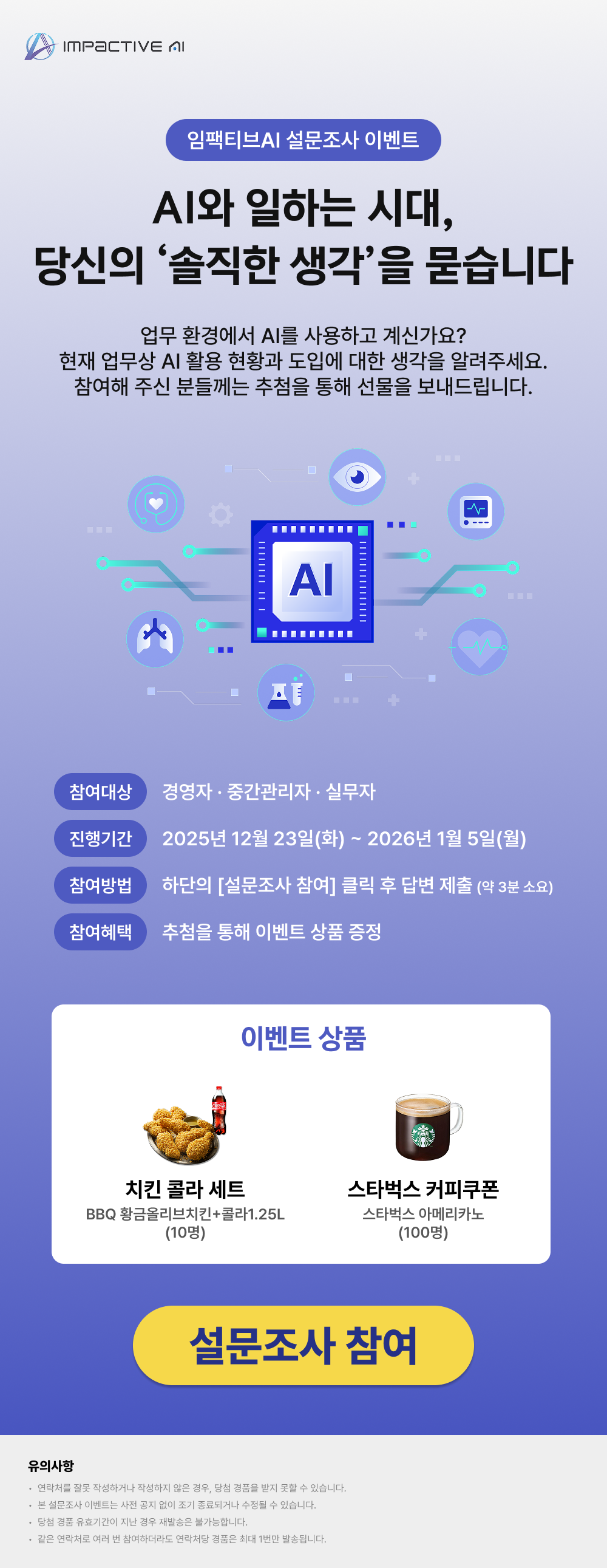 응답자 중 추첨을 통해 치킨(10명) & 스타벅스 커피쿠폰(100명)과 설문 결과 리포트를 보내드리니, 많은 관심과 참여 부탁드립니다.